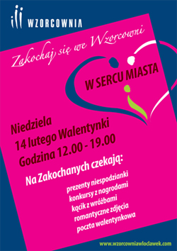 „Zakochaj się we Wzorcowni” - to główne hasło tegorocznego Święta Zakochanych, które obchodzone będzie we Wzorcowni po raz pierwszy. Na wszystkich zakochanych oraz poszukujących miłości czekać będzie wiele zabaw i konkursów. Tego dnia Wzorcownia stanie się najbardziej romantycznym zakątkiem we Włocławku.